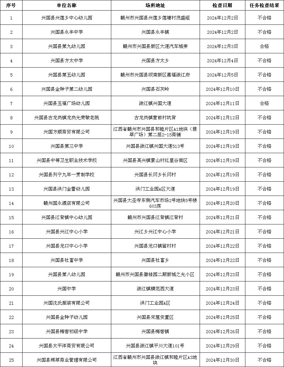 2024年12月份江西省“雙隨機、一公開”消防監管信息系統抽中單位檢查結果公示
