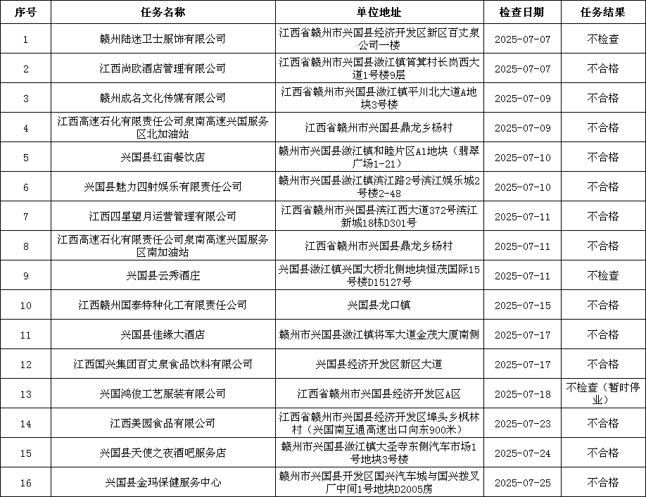 2025年7月份江西省“雙隨機、一公開”消防監管信息系統抽中單位檢查結果公示