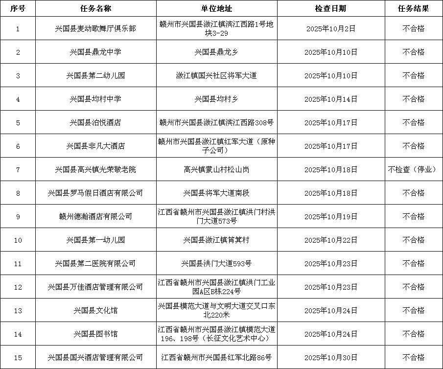 2025年10月份江西省“雙隨機、一公開”消防監(jiān)管信息系統(tǒng)抽中單位檢查結(jié)果公示