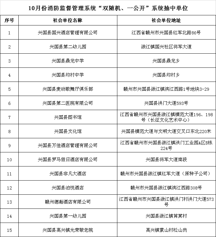 附件為10月份“雙隨機、一公開”消防監(jiān)督抽查系統(tǒng)隨機生成本月檢查的單位,共15家。