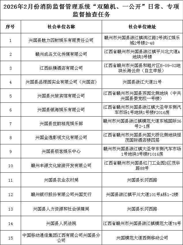 為深入推進全市火災防控工作,進一步預防和減少火災危害,保障公共安全,督促各單位、各場所盡職盡責,根據《中華人民共和國消防法》、《消防監督檢查規定》等有關法律法規要求,興國縣消防救援大隊將依法開展“雙隨機、一公開”消防監督抽查,特制定抽查計劃并公告如下:
