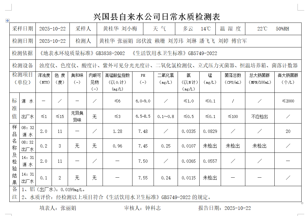 水質常規檢測臺賬(2025年10月22日)