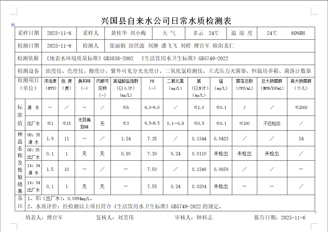 水質(zhì)常規(guī)檢測(cè)臺(tái)賬(2025年11月6日)