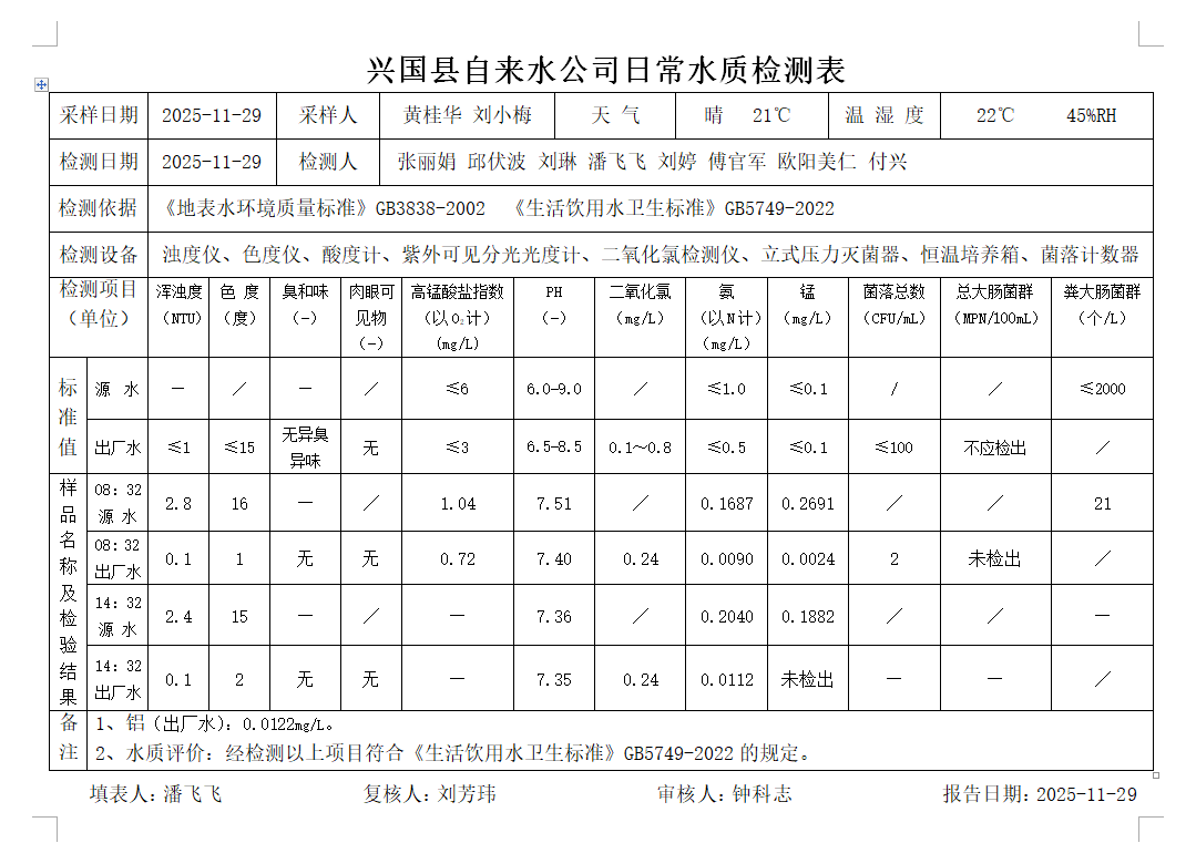 水質(zhì)常規(guī)檢測臺賬(2025年11月29日)
