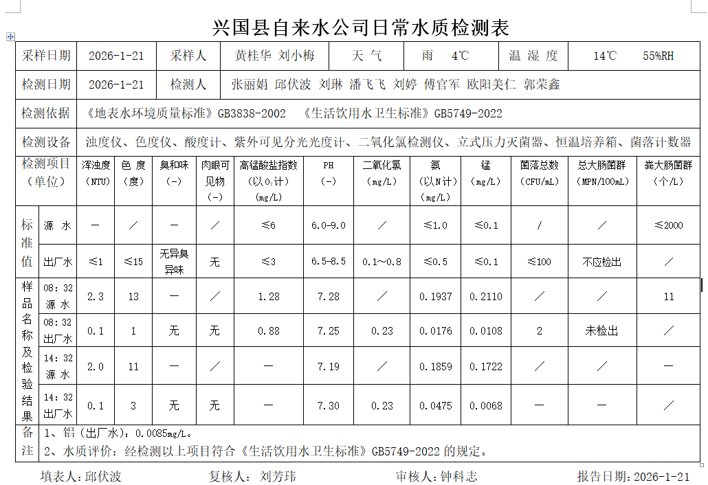 水質(zhì)常規(guī)檢測(cè)臺(tái)賬(2026年1月21日)