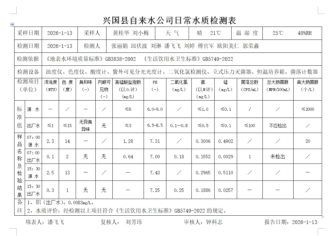 水質常規檢測臺賬(2026年1月13日)