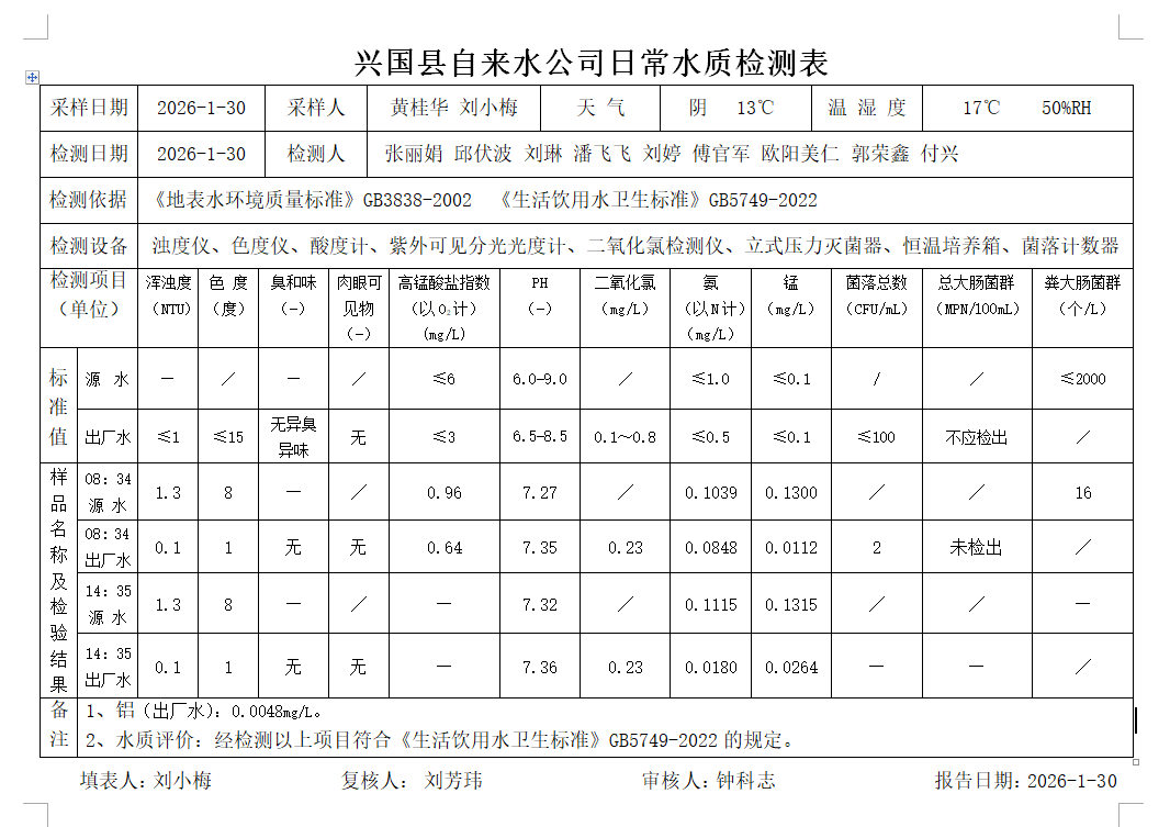 水質常規檢測臺賬(2026年1月30日)