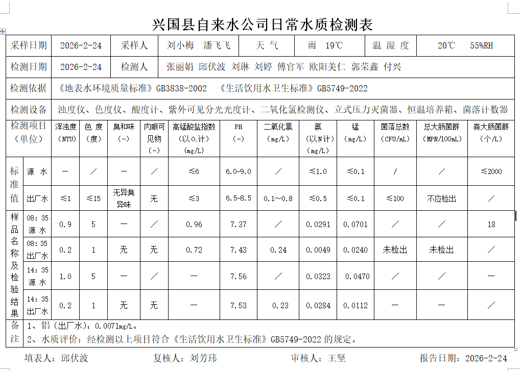 水質(zhì)常規(guī)檢測(cè)臺(tái)賬(2026年2月24日)