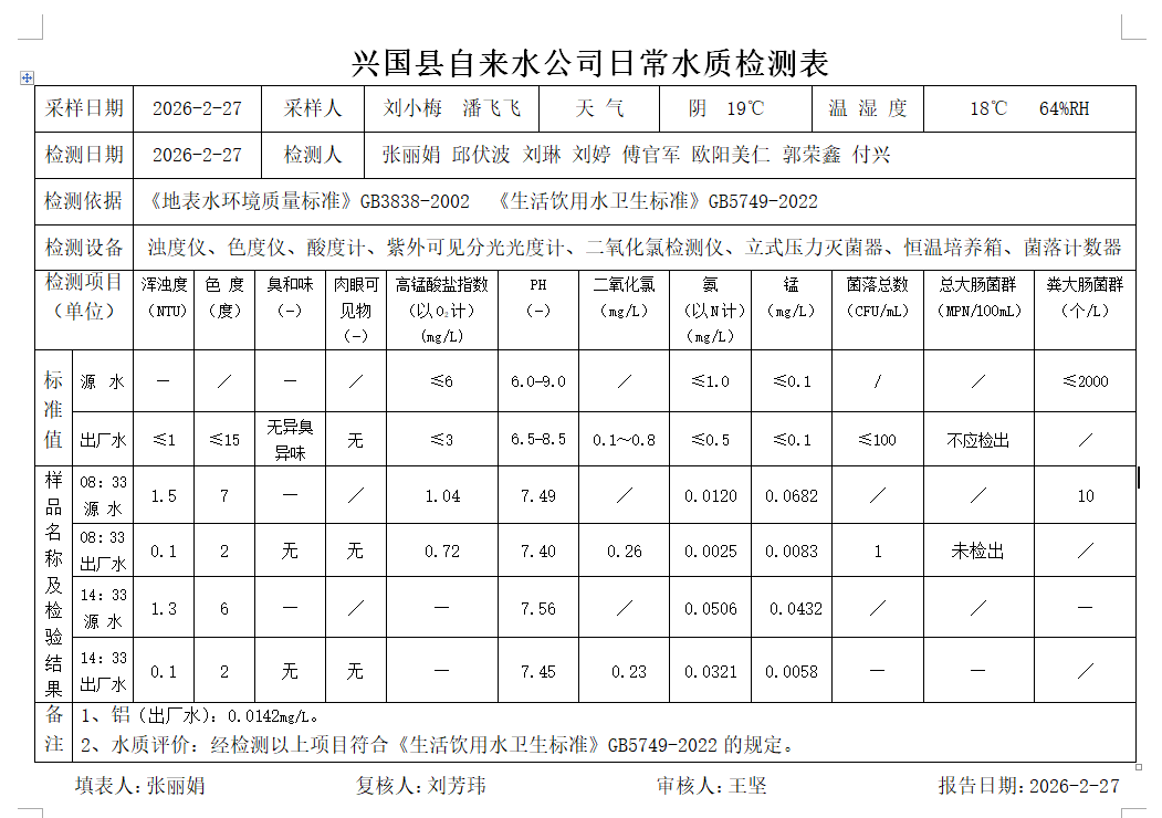 水質常規檢測臺賬(2026年2月27日)