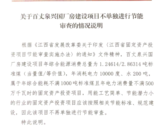 興行審投資字〔2025〕1021號關于百丈泉興國廠房建設項目不單獨進行節能審查的情況說明