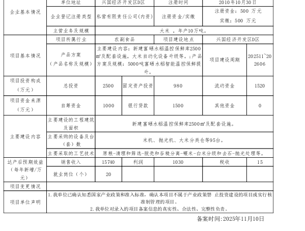 興行審投資字〔2025〕995號長豐米業興國富硒水稻智能溫控保鮮提升項目備案通知書