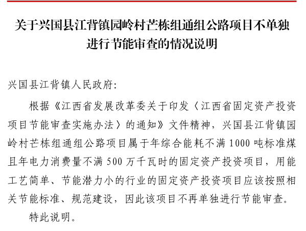 興行審投資字〔2025〕1008號關于興國縣江背鎮園嶺村芒棟組通組公路項目不單獨進行節能審查的情況說明