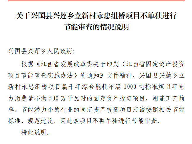 興行審?fù)顿Y字〔2025〕1000號(hào)關(guān)于興國(guó)縣興蓮鄉(xiāng)立新村永忠組橋項(xiàng)目不單獨(dú)進(jìn)行節(jié)能審查的情況說明