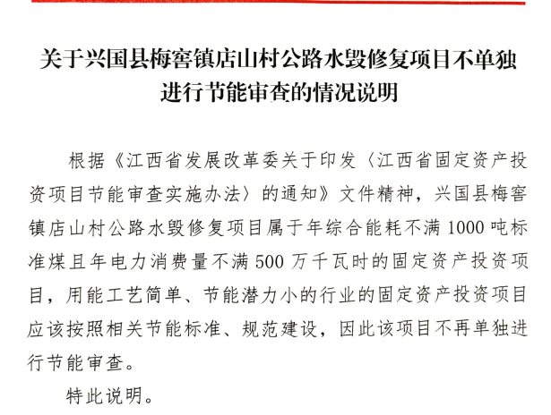 興行審投資字〔2025〕981號關于興國縣梅窖鎮店山村公路水毀修復項目不單獨進行節能審查的情況說明