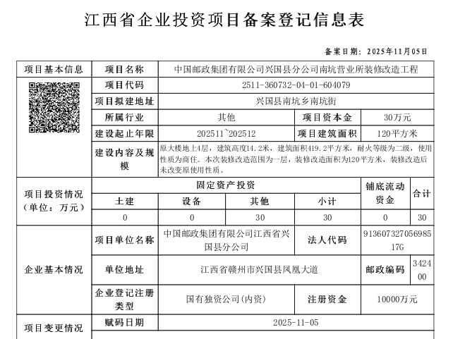 興行審投資字〔2025〕977號中國郵政集團有限公司興國縣分公司南坑營業(yè)所裝修改造工程備案通知書