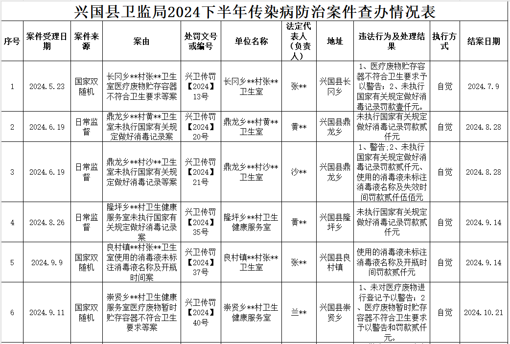 興國縣衛(wèi)監(jiān)局2024年下半年傳染病防治案件查辦情況通報