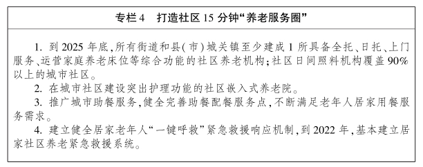 到2025年,居家社區(qū)機構(gòu)相協(xié)調(diào)、醫(yī)養(yǎng)康養(yǎng)相結(jié)合的養(yǎng)老服務(wù)體系更加健全,覆蓋城鄉(xiāng)、功能完善、結(jié)構(gòu)合理、供給多元、服務(wù)優(yōu)質(zhì)、監(jiān)管到位、方便可及的養(yǎng)老服務(wù)新格局更加完善;人人享有的基本養(yǎng)老服務(wù)制度建立健全,基礎(chǔ)設(shè)施更加鞏固,供給結(jié)構(gòu)更加優(yōu)化,服務(wù)產(chǎn)品更加豐富,服務(wù)市場更加開放,養(yǎng)老服務(wù)信息化、標準化、專業(yè)化水平不斷提高,養(yǎng)老事業(yè)和產(chǎn)業(yè)有效協(xié)同、高質(zhì)量發(fā)展,老年人及其家屬獲得感、幸福感、安全感顯著提升。