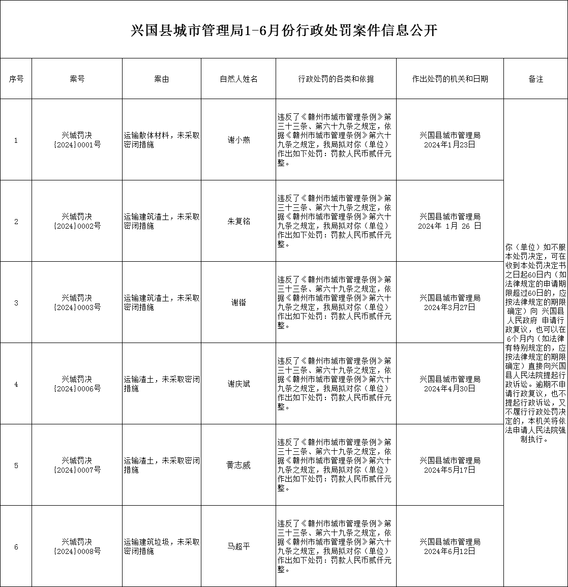 興國縣城市管理局1-6月份行政處罰案件信息公開