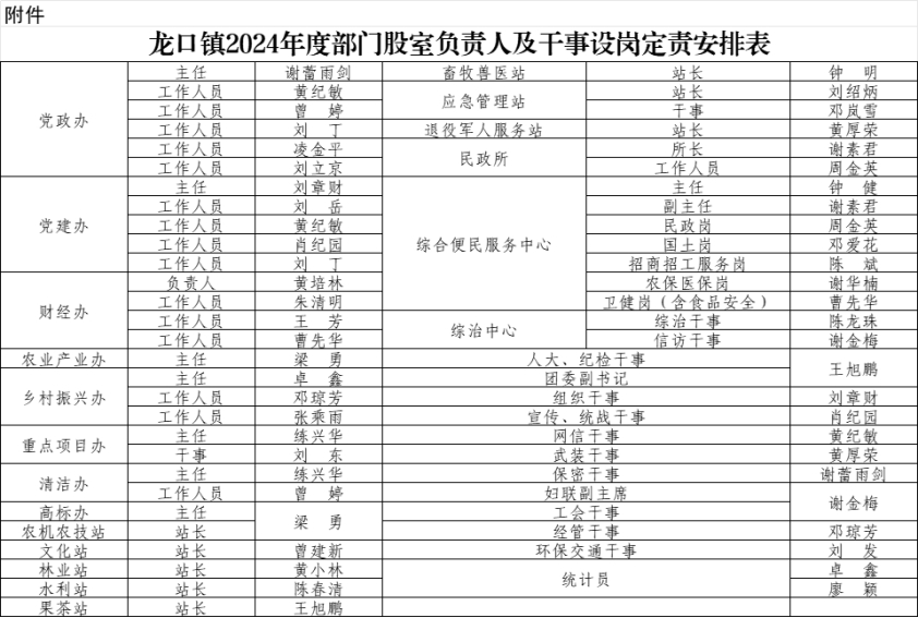 附件:龍口鎮(zhèn)2024年度部門(mén)股室負(fù)責(zé)人及干事設(shè)崗定責(zé)安排表
