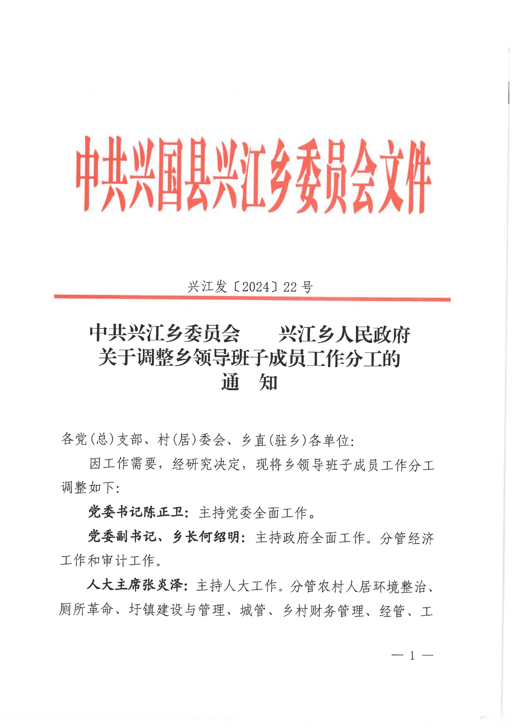 興江鄉關于調整鄉領導班子成員工作分工的通知