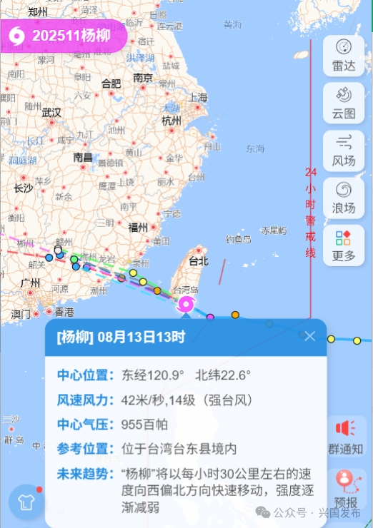 今年第11號(hào)臺(tái)風(fēng)“楊柳”(強(qiáng)臺(tái)風(fēng)級(jí))的中心已于8月13日13時(shí)前后在我國(guó)臺(tái)灣省臺(tái)東縣太麻里鄉(xiāng)沿海登陸,登陸時(shí)中心附近最大風(fēng)力14級(jí)(42米/秒),中心最低氣壓955百帕。