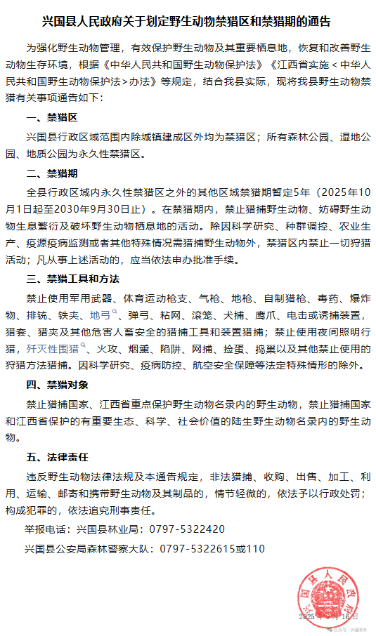 興國縣人民政府關于劃定野生動物禁獵區和禁獵期的通告?