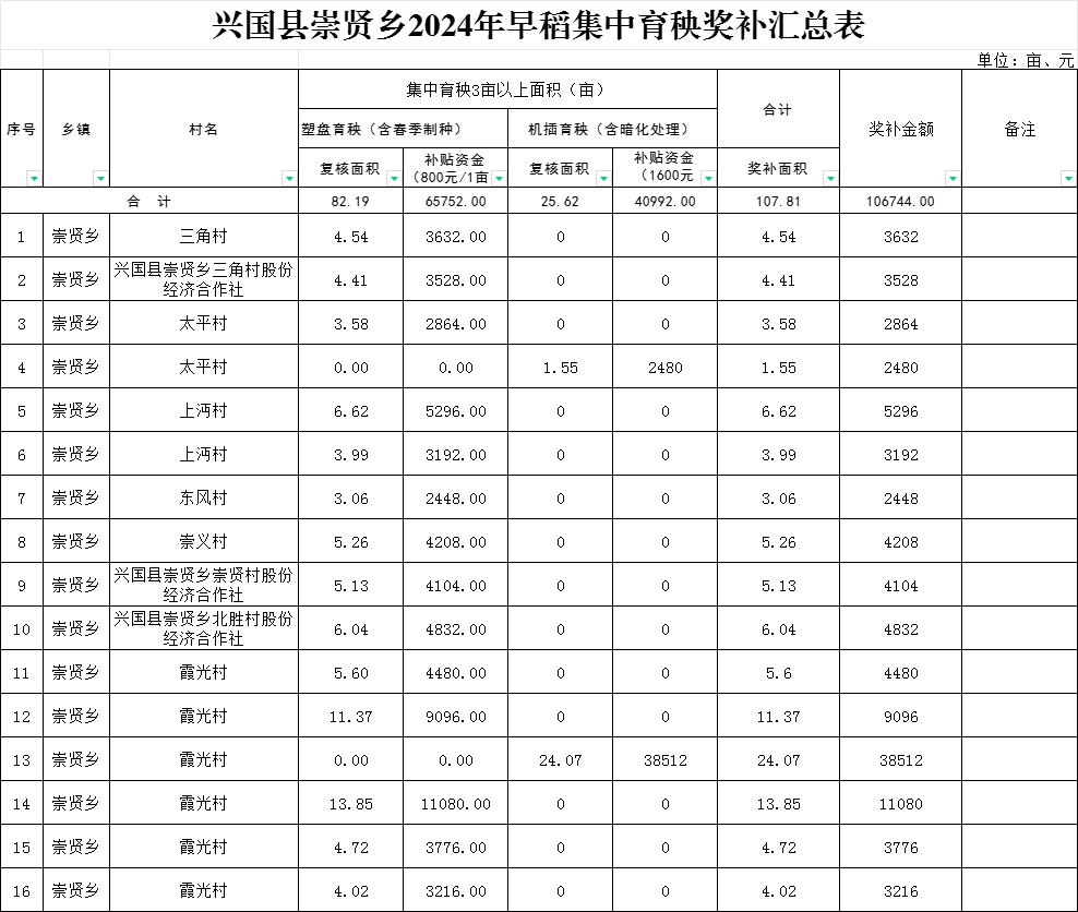 興國縣崇賢鄉2024年早稻集中育秧獎補