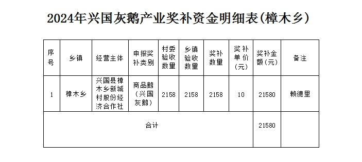 【涉農補貼】2024年興國灰鵝產業獎補資金明細表(樟木鄉)