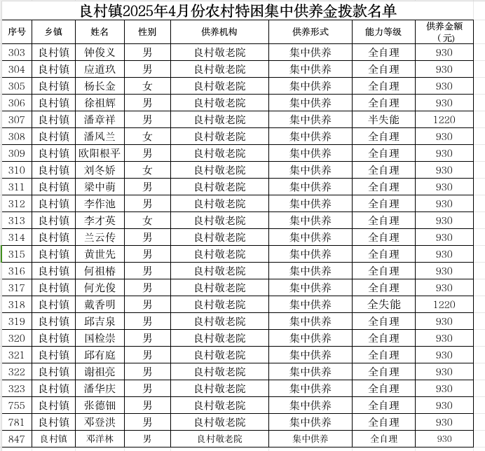 良村鎮2025年4月份農村特困集中供養金撥款名單
