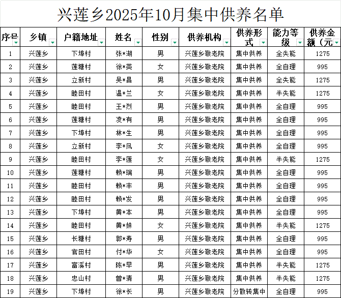 【社會救助】興蓮鄉2025年10月集中供養名單