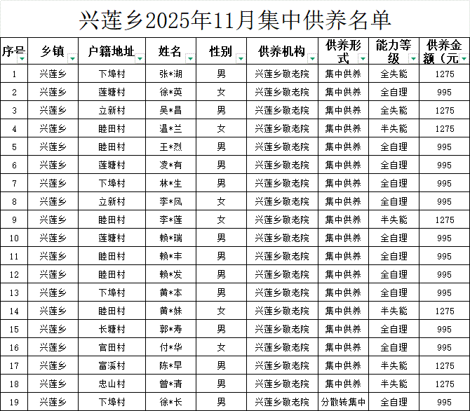 【社會救助】興蓮鄉2025年11月集中供養名單