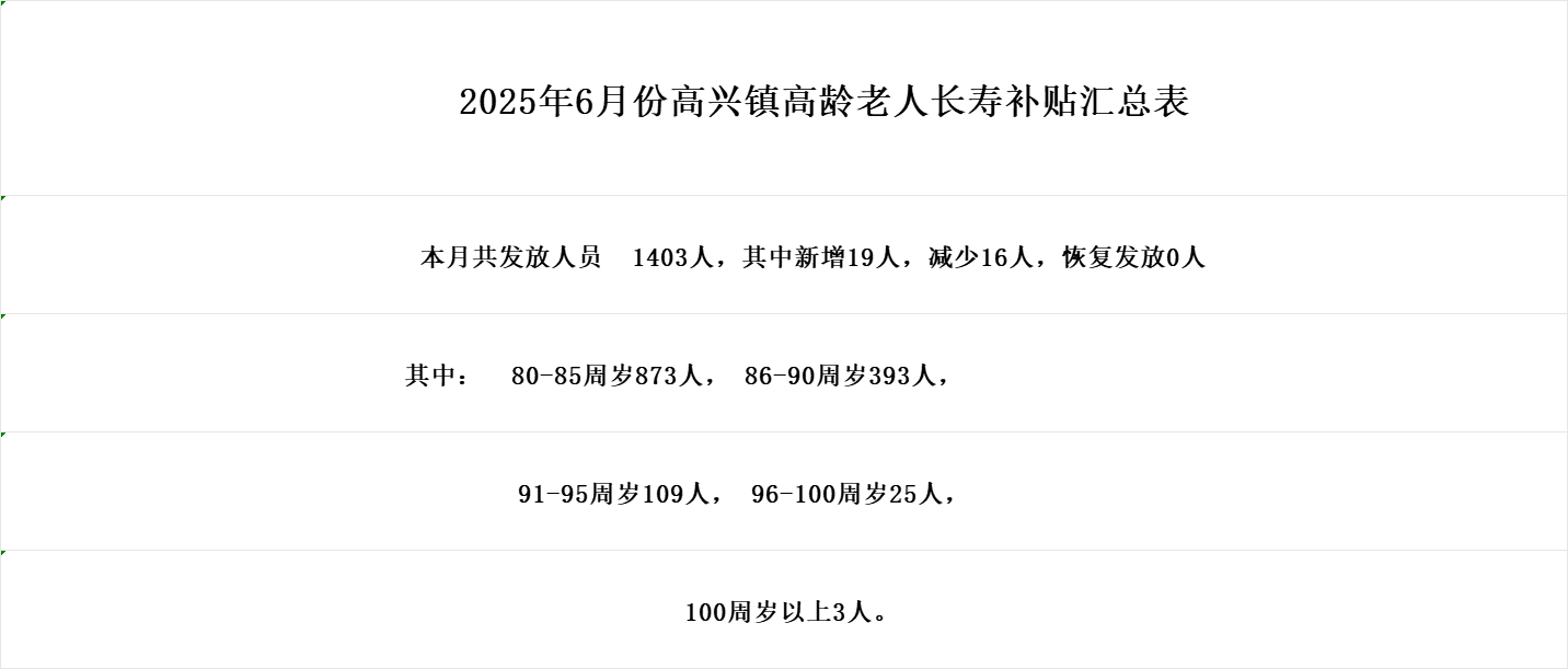 【高齡補(bǔ)貼】2025年6月份高興鎮(zhèn)高齡老人長(zhǎng)壽補(bǔ)貼匯總表