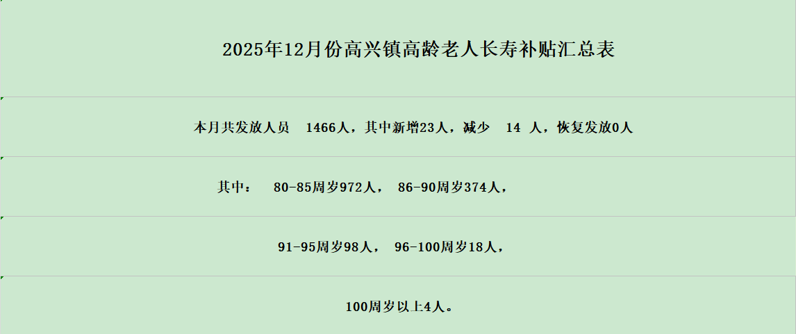 【高齡補貼】2025年12月份高興鎮高齡老人長壽補貼匯總表