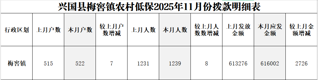 興國縣梅窖鎮農村低保2025年11月份撥款明細表
