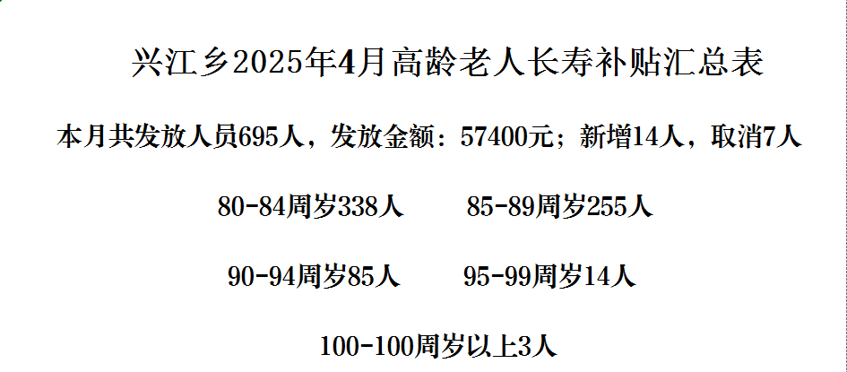 【養老服務】興江鄉2025年4月份高齡老人長壽補貼發放公示