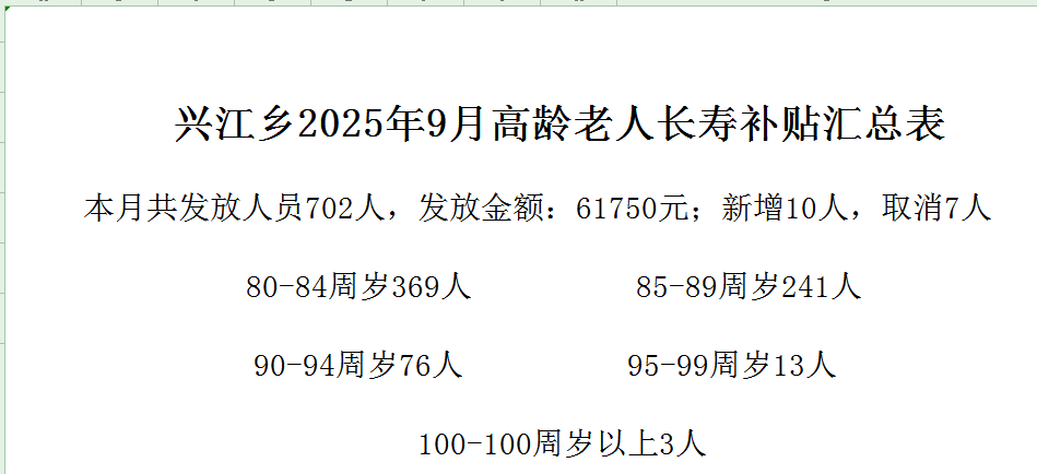 【養老服務】興江鄉2025年9月份高齡老人長壽補貼發放公示
