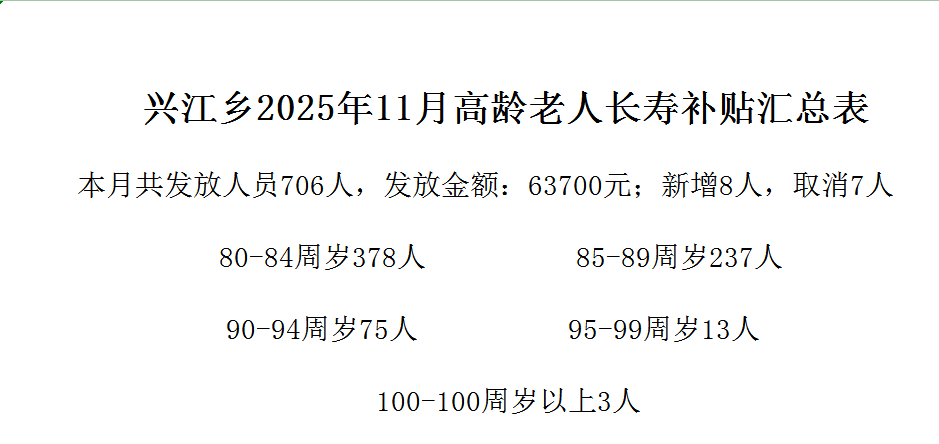 【養老服務】興江鄉2025年11月份高齡老人長壽補貼發放公示