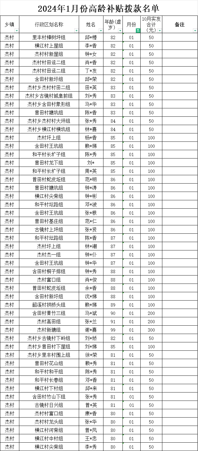 2024年1月份高齡補貼撥款名單