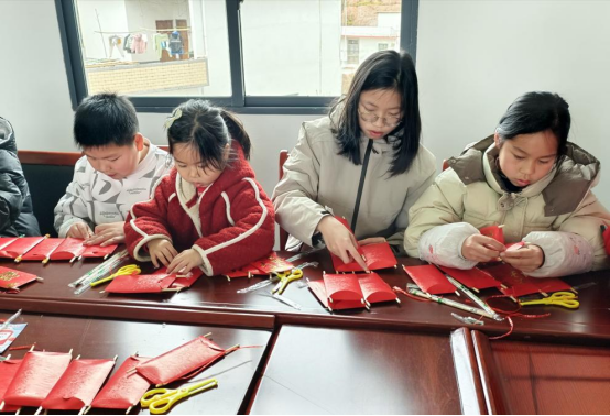 活動中,志愿者首先向孩子們介紹了元宵節的由來、習俗以及燈籠的寓意,并展示了利用紅包等材料制作燈籠的創意方法,激發了孩子們的濃厚興趣。隨后,在志愿者的指導下,孩子們迫不及待地開始動手制作。只見孩子們先將紅包的四個角剪掉,然后將一次性筷子從紅包預留的孔洞中穿過,每個紅包穿兩根筷子,再用橡皮筋將相鄰的紅包上下固定,圍成一個六邊形。最后,將木棍串成米字形,固定在六邊形的上下兩端,一個別致新穎的紅包燈籠就制作完成了。