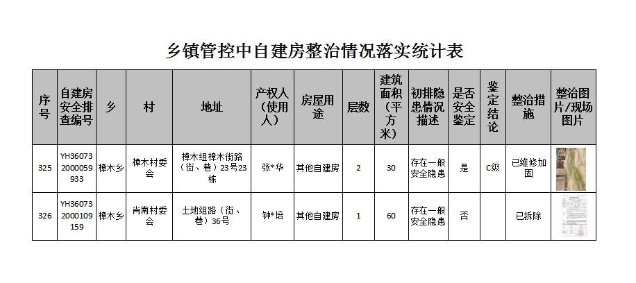 樟木鄉(xiāng)管控中自建房整治情況落實統(tǒng)計表