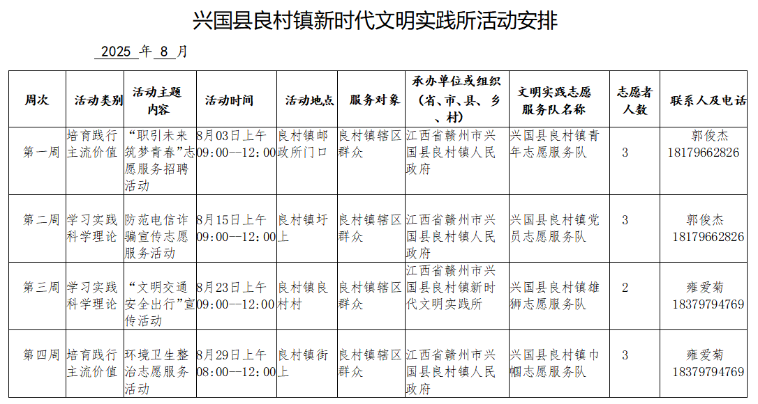 2025年8月份良村鎮新時代文明實踐所活動公示