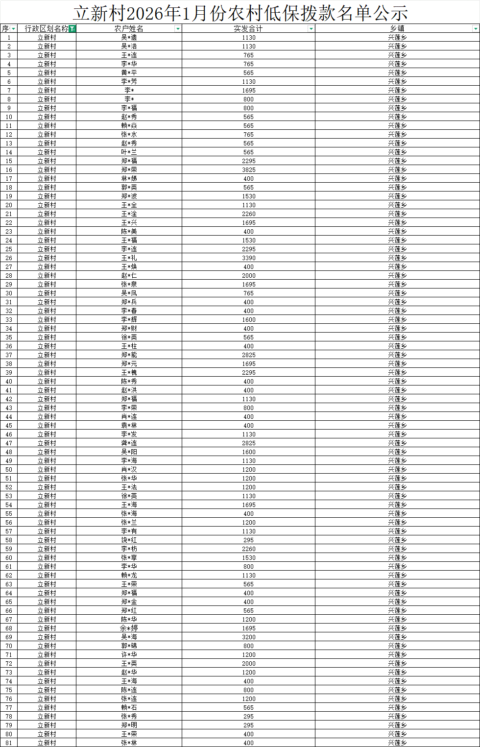 【社會救助】立新村2026年1月份農村低保撥款名單公示