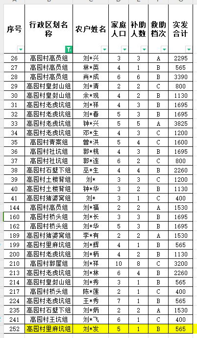高園村10月份農(nóng)村低保匯總名單