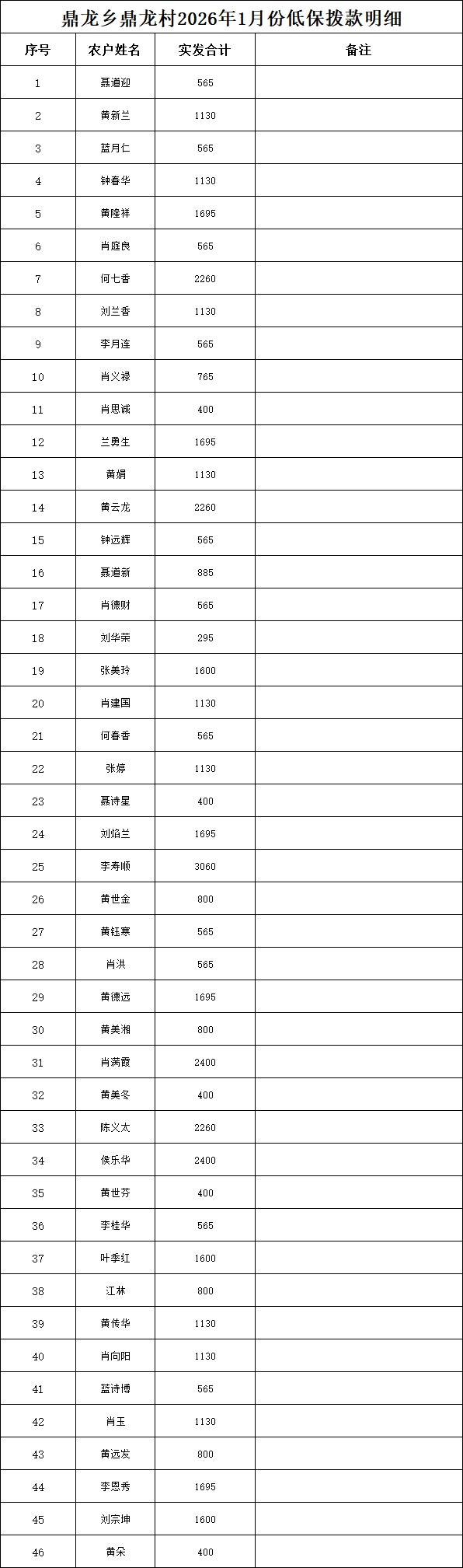 鼎龍鄉(xiāng)鼎龍村2026年1月份低保撥款明細(xì)