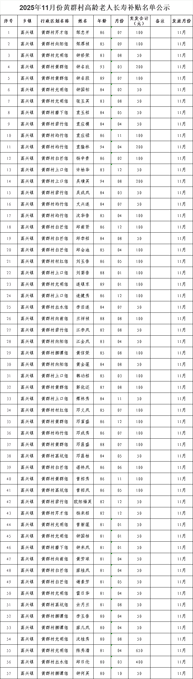 2025年11月份黃群村高齡老人長壽補貼名單公示?