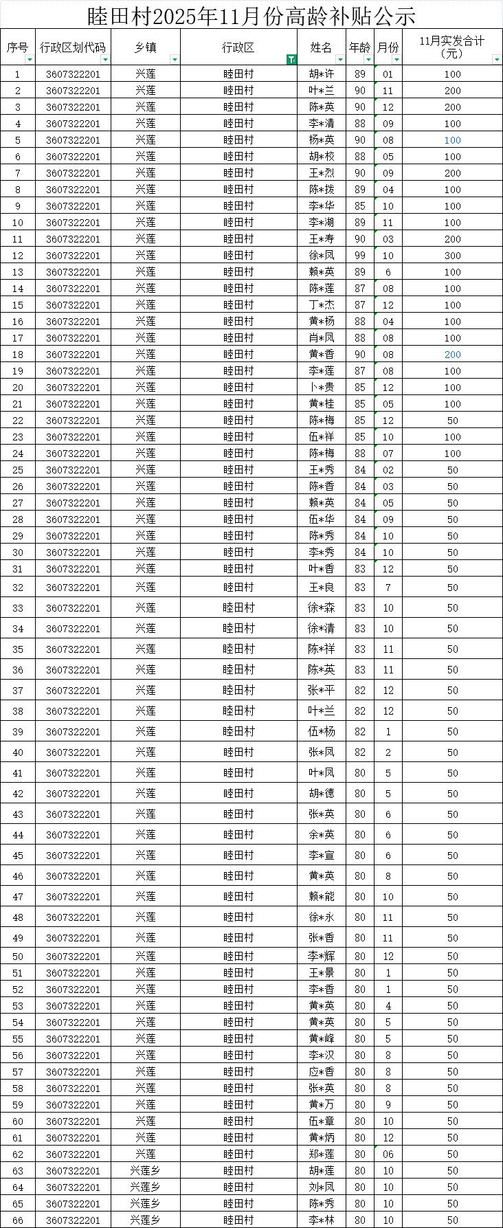 【高齡補貼】睦田村2025年11月份高齡補貼公示