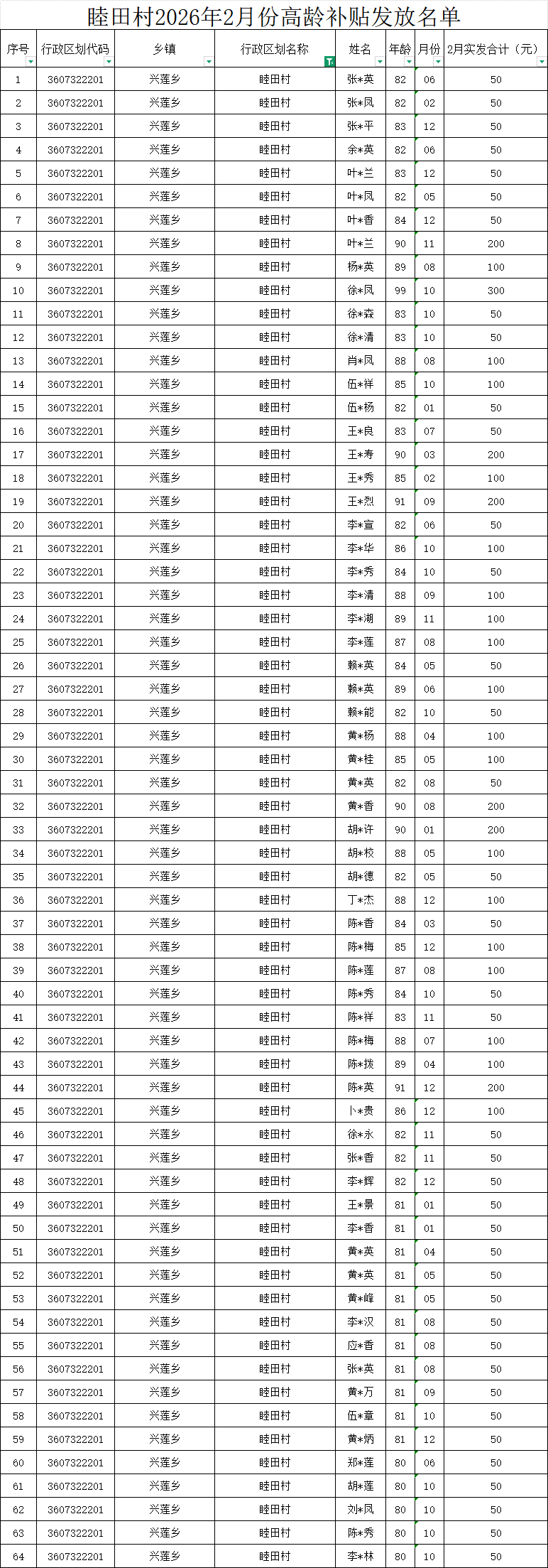 【養(yǎng)老服務(wù)】睦田村2026年2月份高齡補貼發(fā)放名單