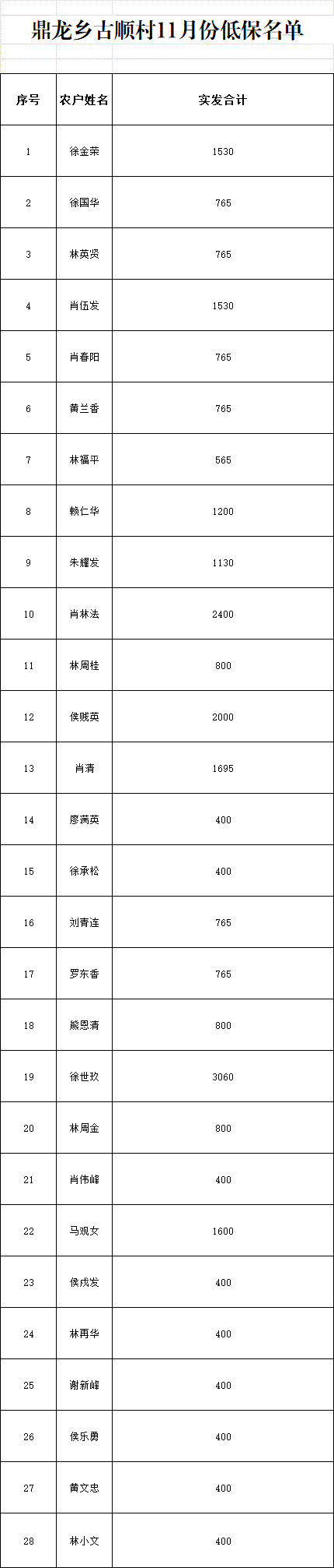 鼎龍鄉古順村11月份低保名單