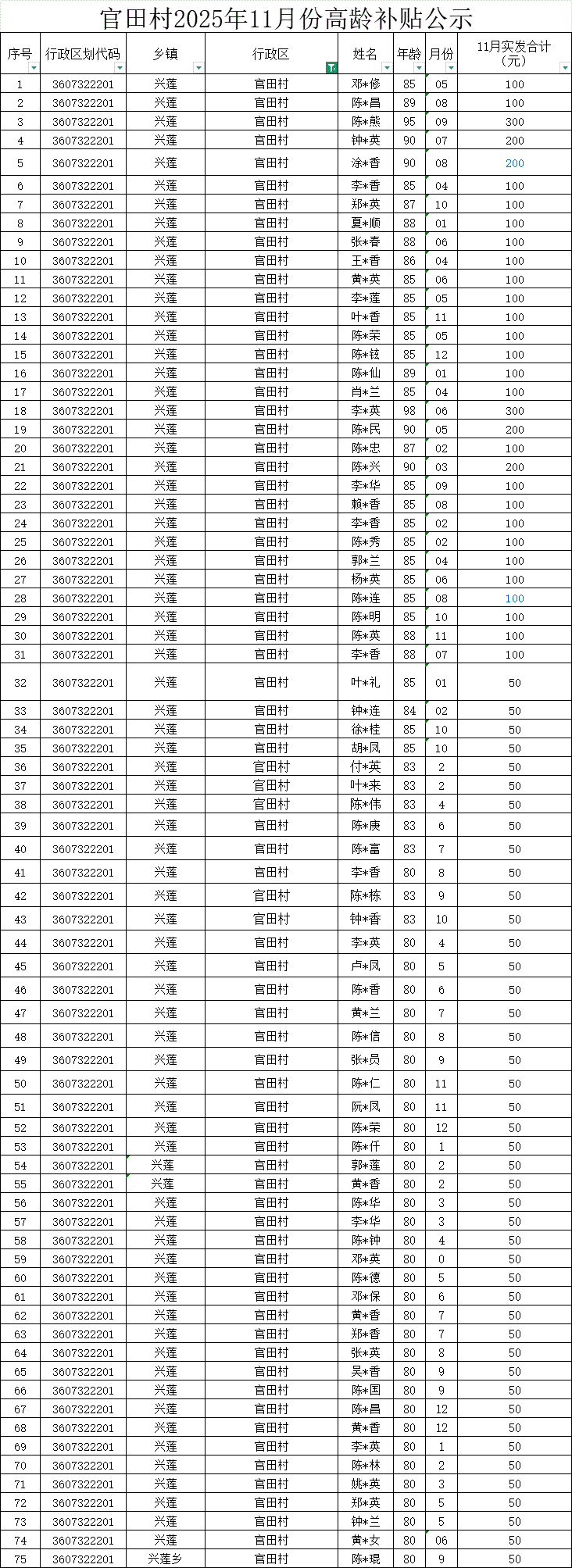 【養老服務】官田村2025年11月份高齡補貼公示