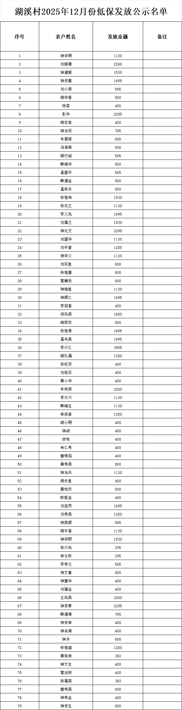 湖溪村2025年12月份低保發放公示名單